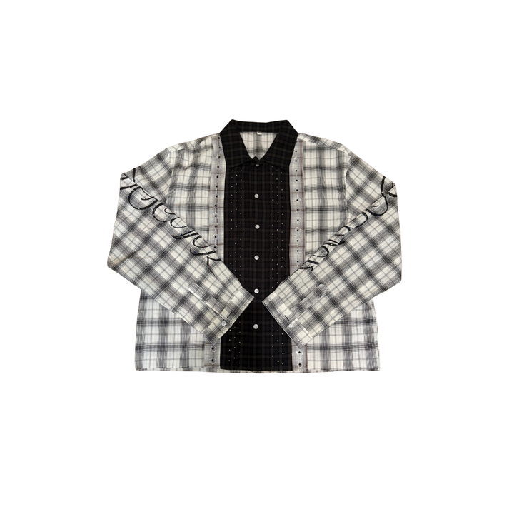 Three flannel patterns stitched into one standout piece. 250 GSM lightweight fabric with a boxy fit and rhinestones across the sleeves, front, and back. Finished with DSCVR logos on both arms. Cold wash, air dry.